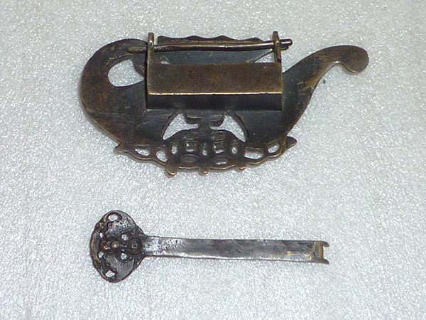 こちらは珍しい琵琶型で少し大きめな錠前です。鍵もついており、もちろん施錠も可能です。